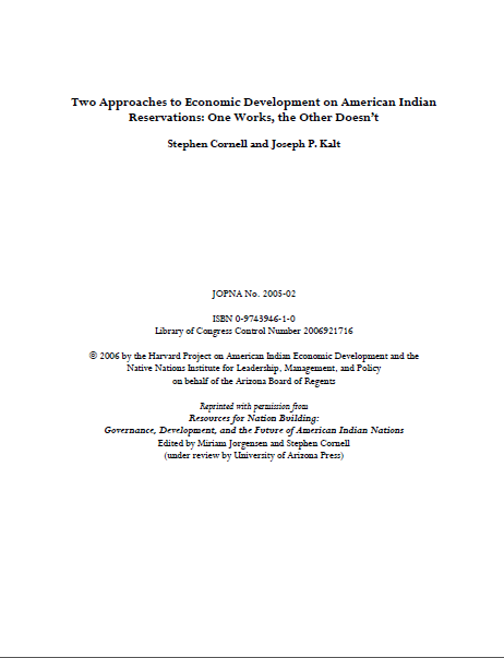 This article discusses the standard approach and the nation building approach of economic development in reservation communities and the benefits of nation building strategies.